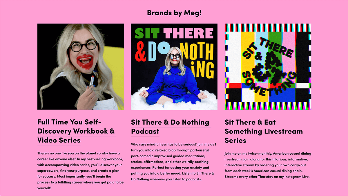 Take Meg Lewis for example! Meg is a designer, comedian, performer, and educator working to make the world a happier place, and her brand stands out like nothing else in the sea of freelance designers out there.