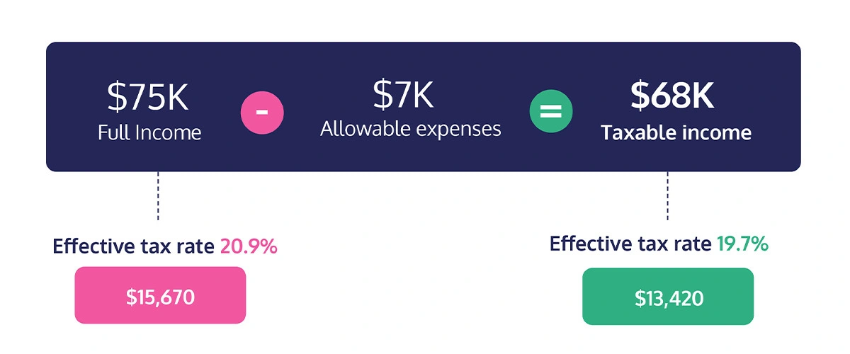At $75k, Bridgette’s effective income tax rate was 20.9%, and she would have had to pay the IRD $15,670 in income tax. By claiming a tax deduction and reducing her taxable income to $68k, her effective tax rate becomes 19.7%, and her tax bill is $13,420. That’s a tax saving of $2,250 just from this one deduction claimed!