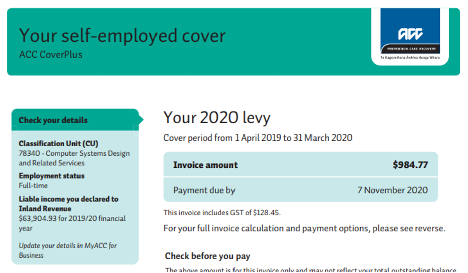 This is true even if you don’t earn much self-employed income, and mainly rely on your permanent/salaried role. You’re still required to pay ACC levies in proportion to your self-employed income.